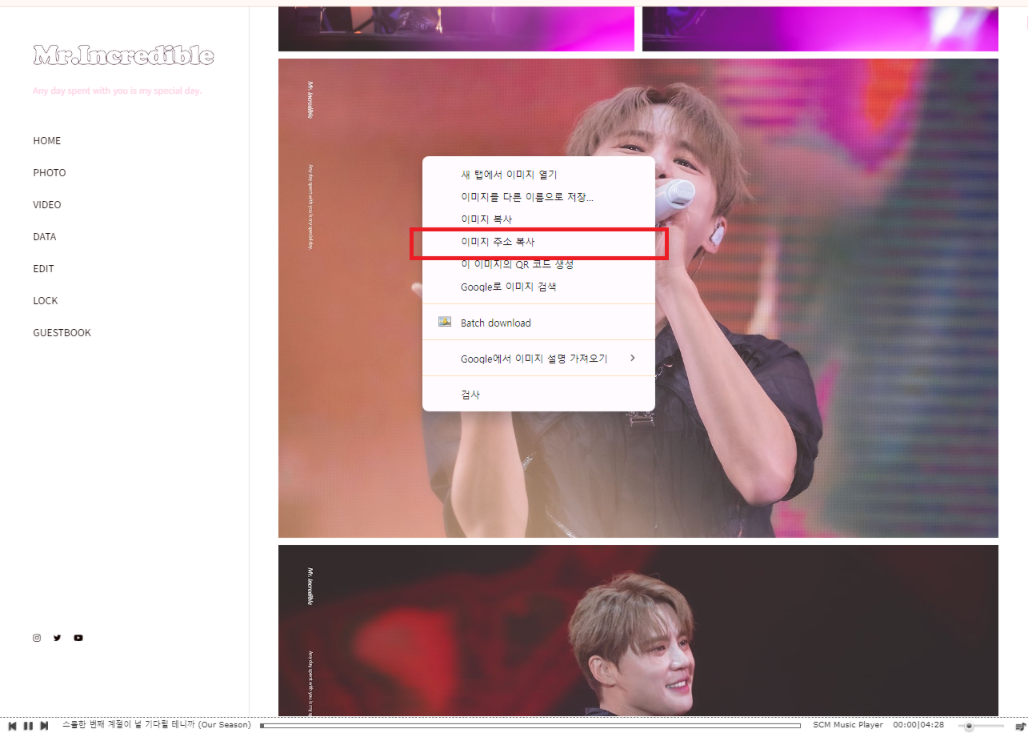 오른쪽 클릭 후 '이미지 주소 복사'를 선택합니다.